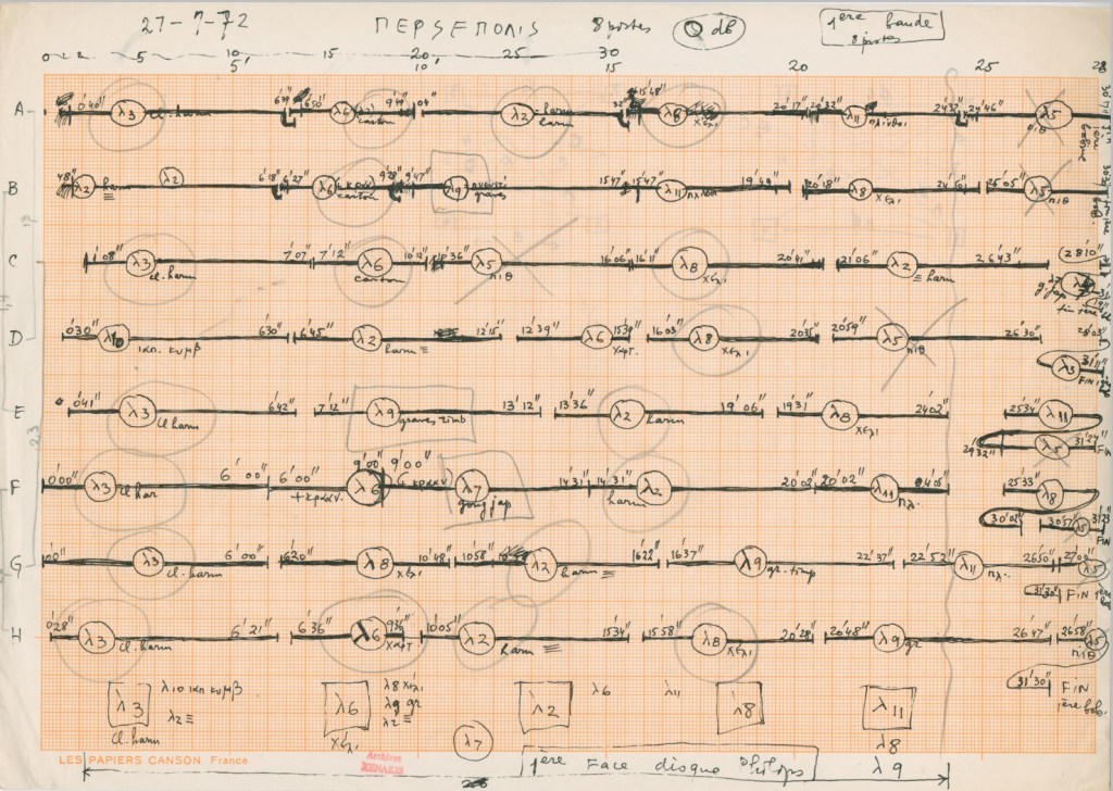 For its design ambition and duration, “Persepolis” undoubtedly marks an absolute peak, not only in Xenakis’ production but also in the coeval electroacoustic and acousmatic research. A work whose importance has been also confirmed, over the years, by the various editions documenting it, and which for this reason makes it necessary to reconstruct its discographic history, with the help of the precise cover notes by Reinhold Friedl.